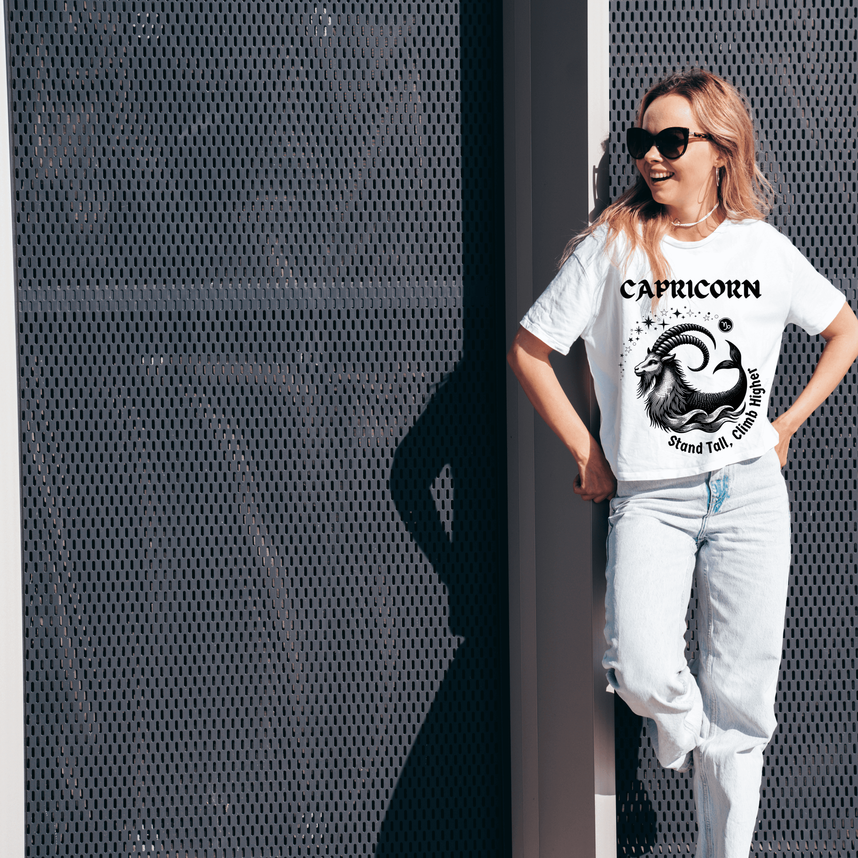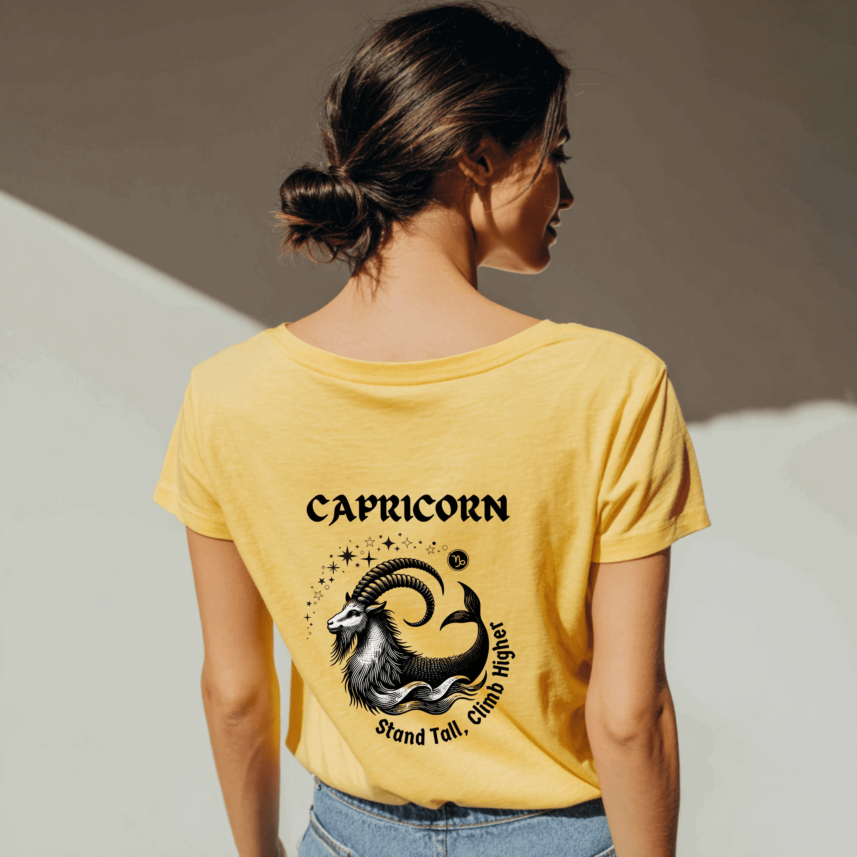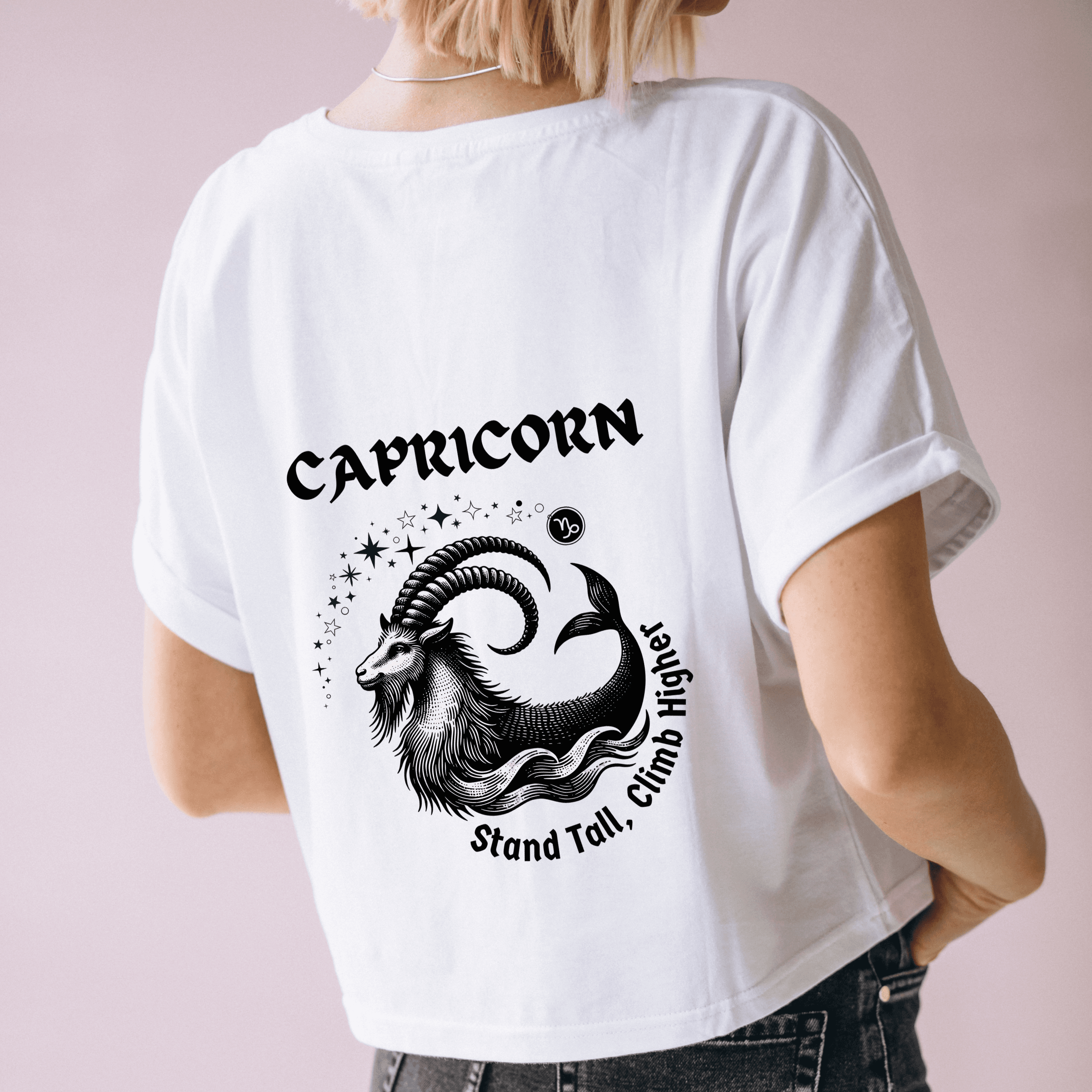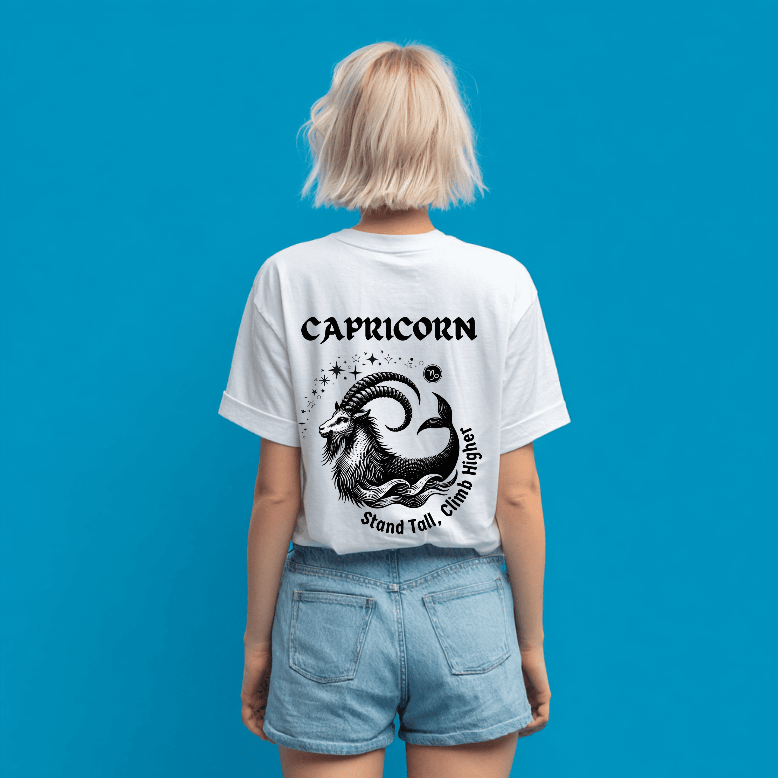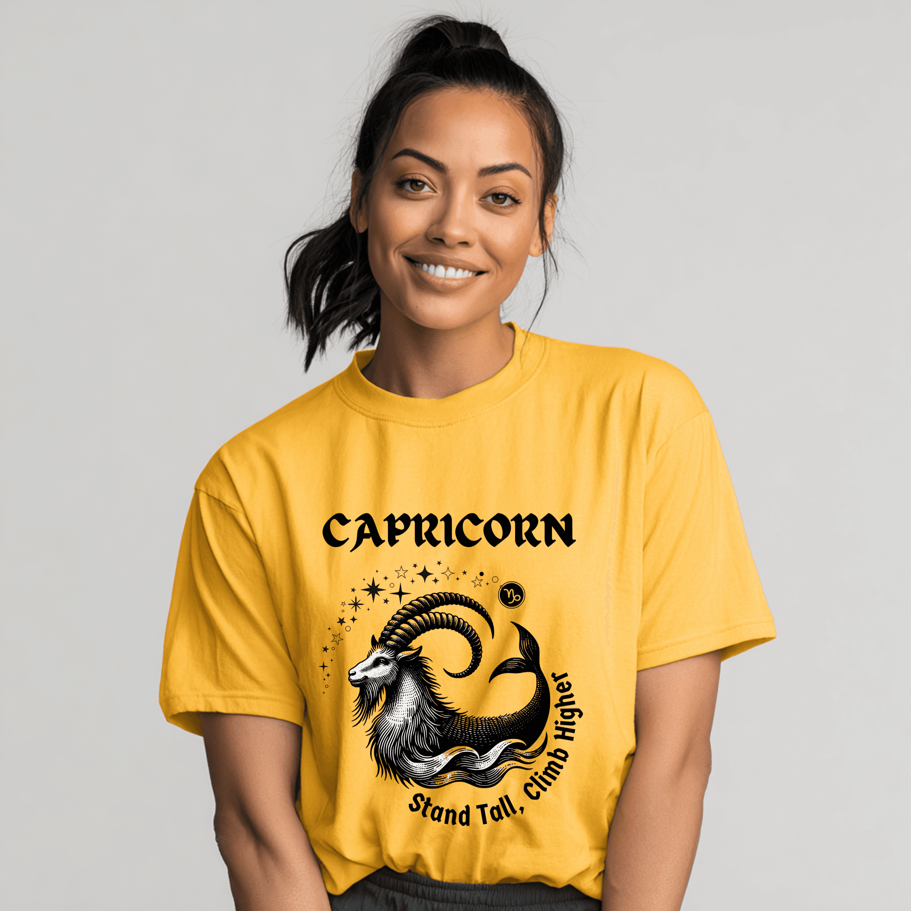 Show your Capricorn pride with our Capricorn Zodiac T-Shirt, a bold and stylish astrology graphic tee designed for those born between December 22 – January 19. Featuring an intricately detailed sea-goat illustration surrounded by cosmic stars and the empowering phrase Stand Tall, Climb Higher, this shirt captures the determination, discipline, and ambition that make Capricorns unstoppable.