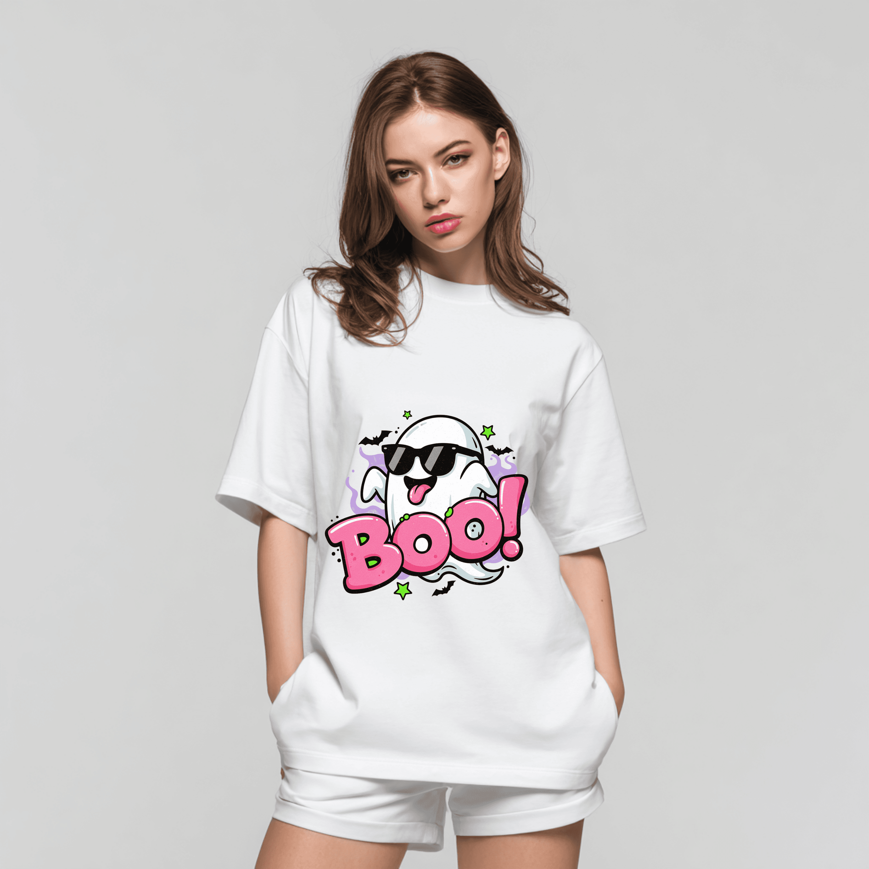 Get ready to say "Boo!" in the cutest way possible this Halloween season with our incredibly fun and funky graphic T-shirt! Featuring an adorable ghost sporting cool sunglasses and bright pink "Boo!" text, this tee is perfect for anyone who loves a playful take on spooky style.