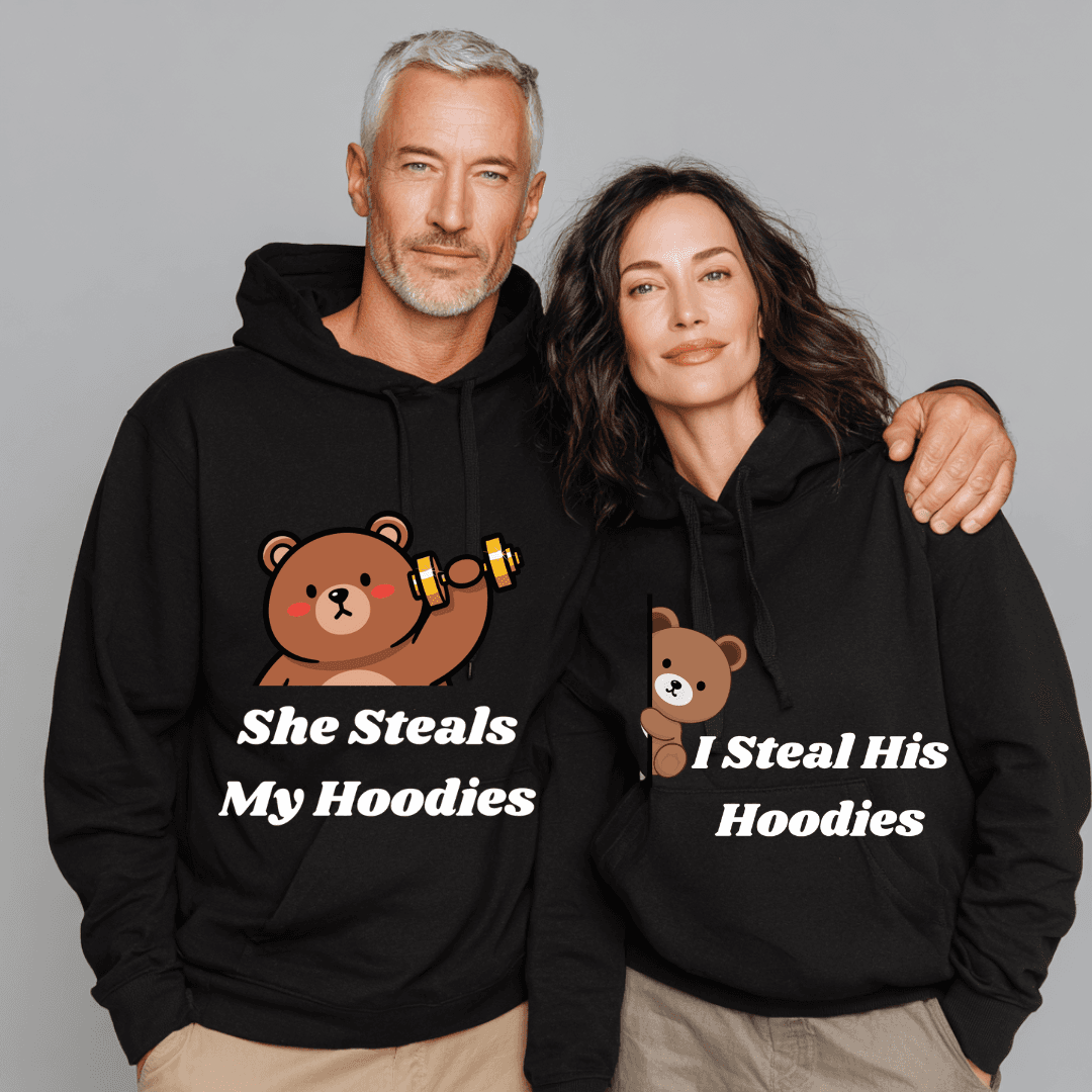 Show off your playful, cute, and cozy side as a couple with this adorable matching black hoodie set. One hoodie features “I Steal His Hoodies”, while the other reads “She Steals My Hoodies” — the perfect fun message for couples who love comfort, cuddles, and sharing clothes.