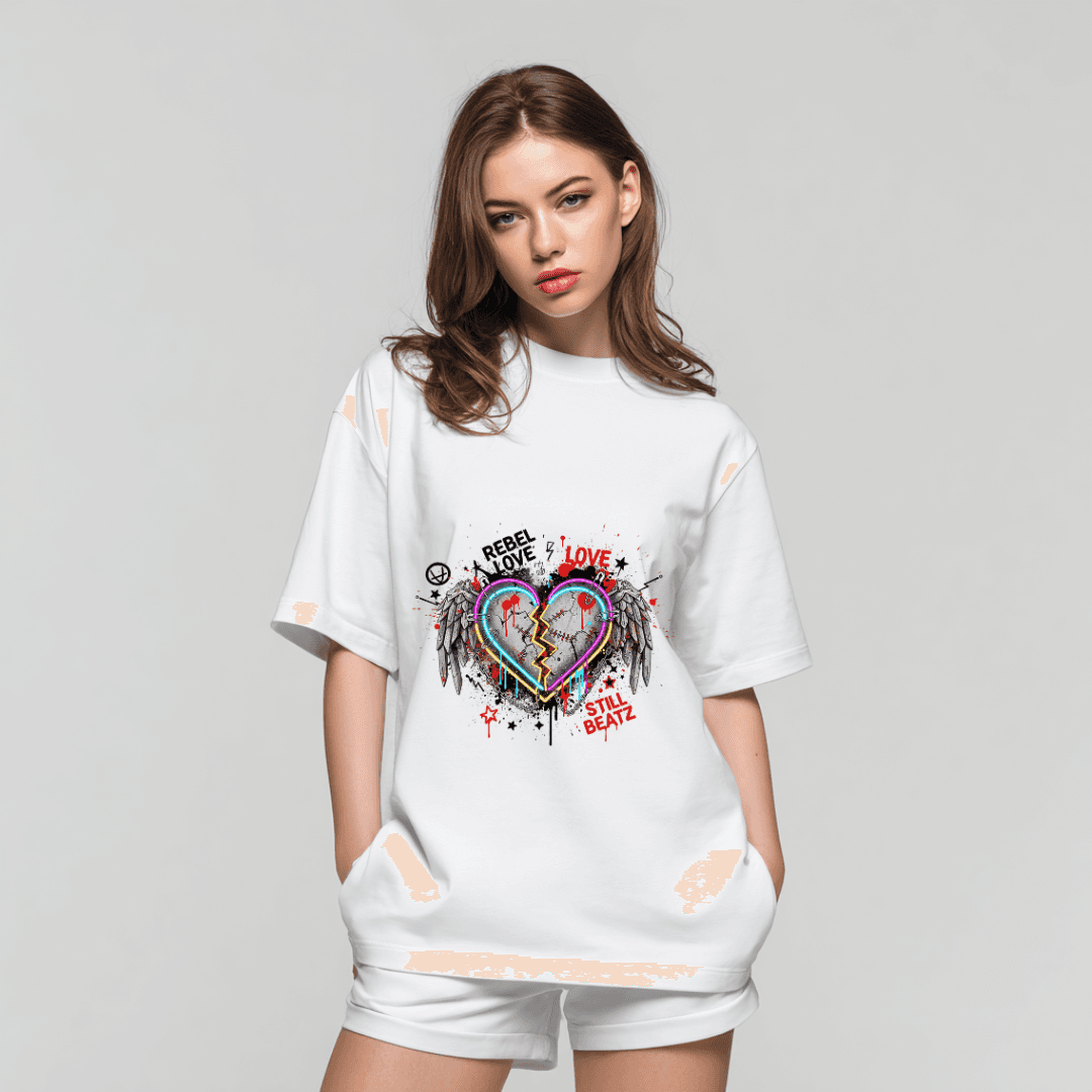 Turn heartbreak into power with this neon shattered heart streetwear T-shirt, featuring bold winged artwork, paint splashes, grunge text and glowing neon edge details.