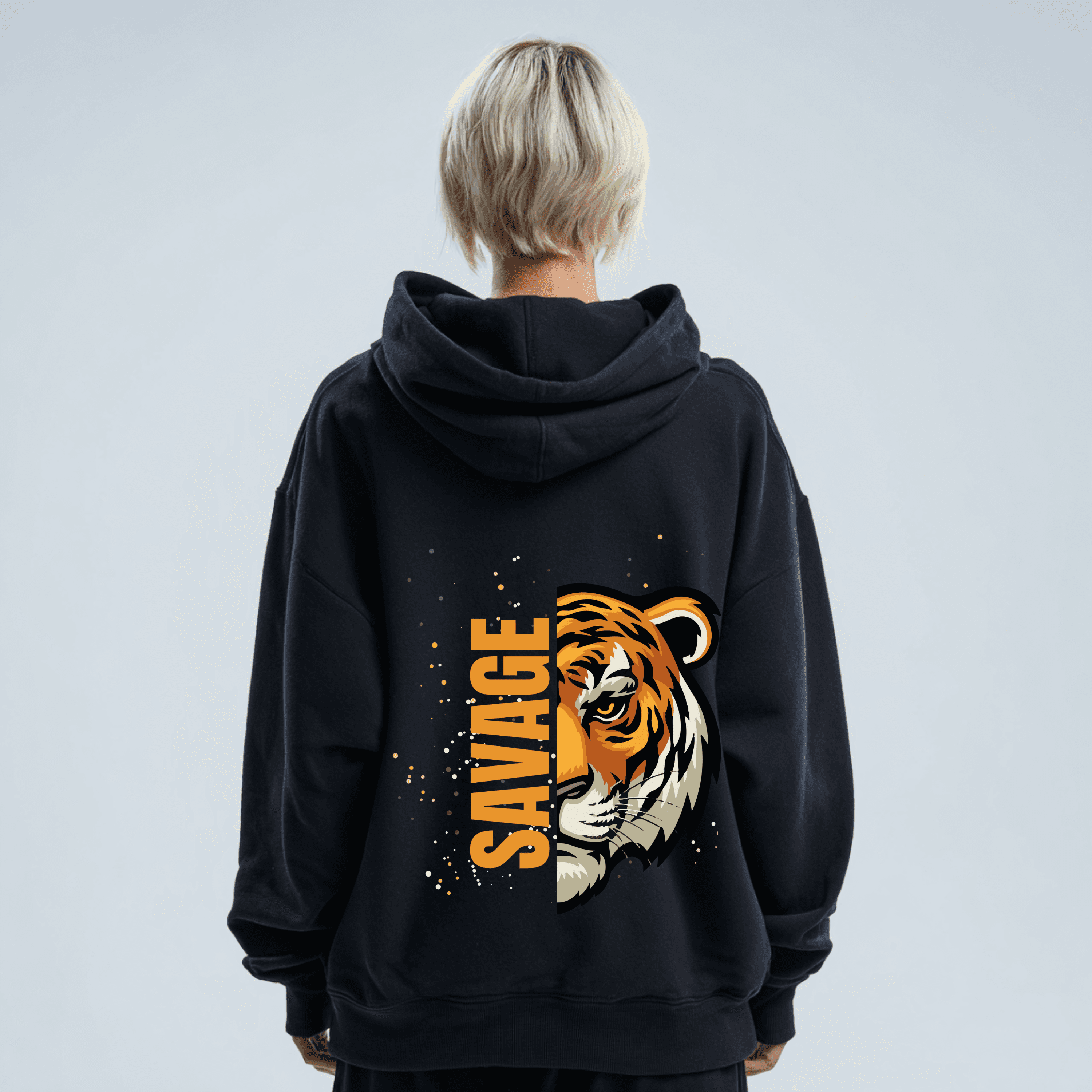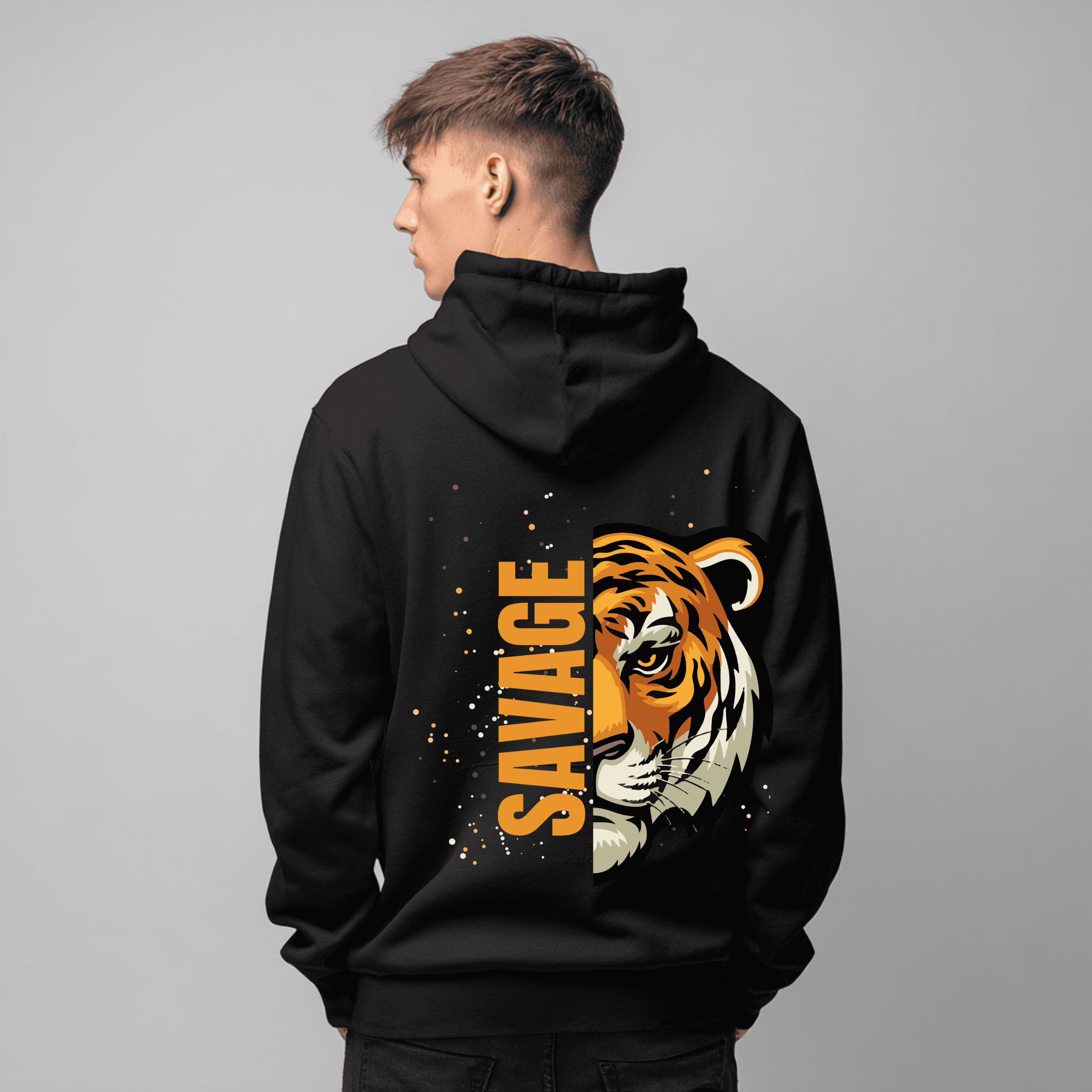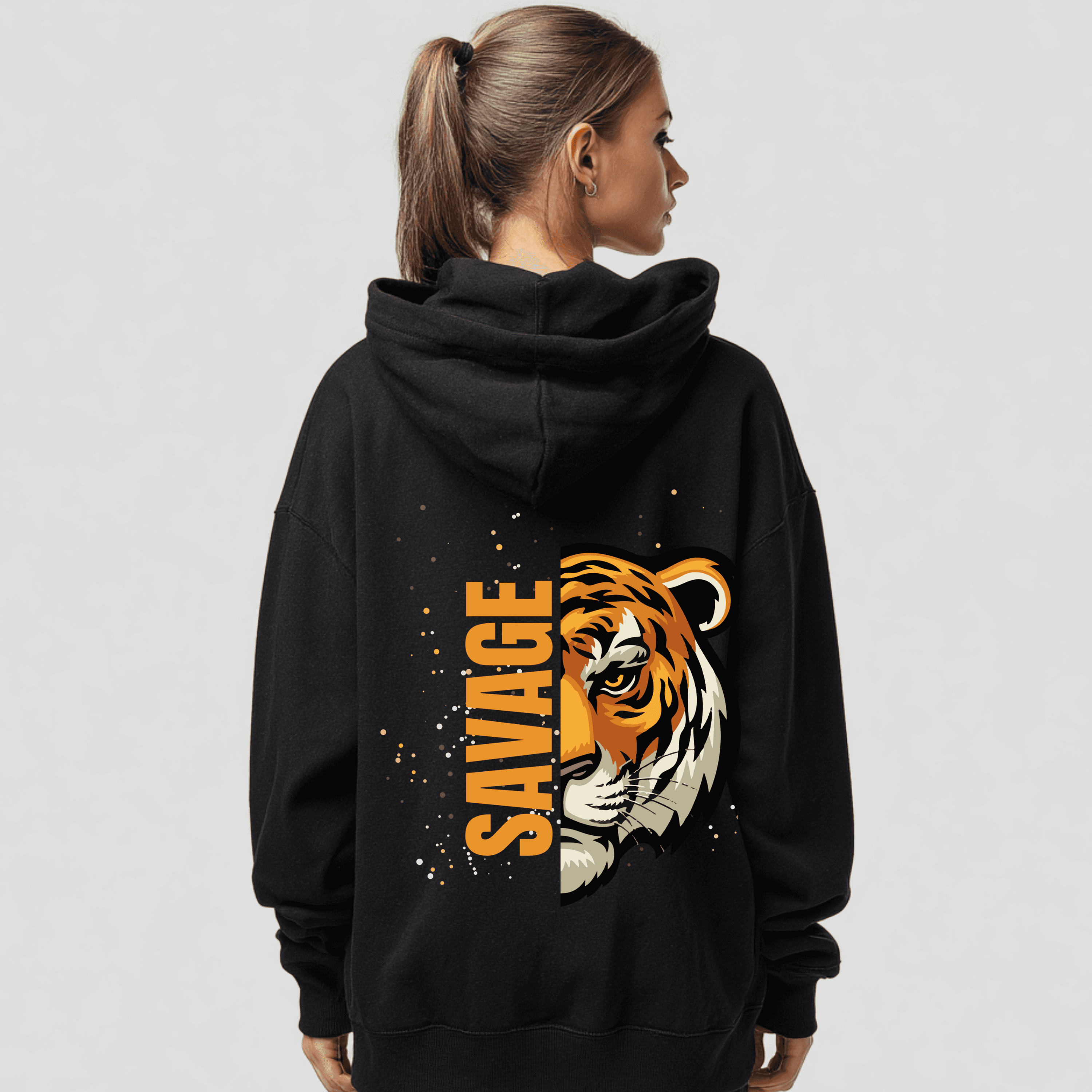 A fierce tiger graphic spans the back, split by the bold vertical “SAVAGE” text, creating a dynamic, eye-catching statement that demands attention. Slight speckle details around the image add artistic flair and depth, ensuring every detail pops.